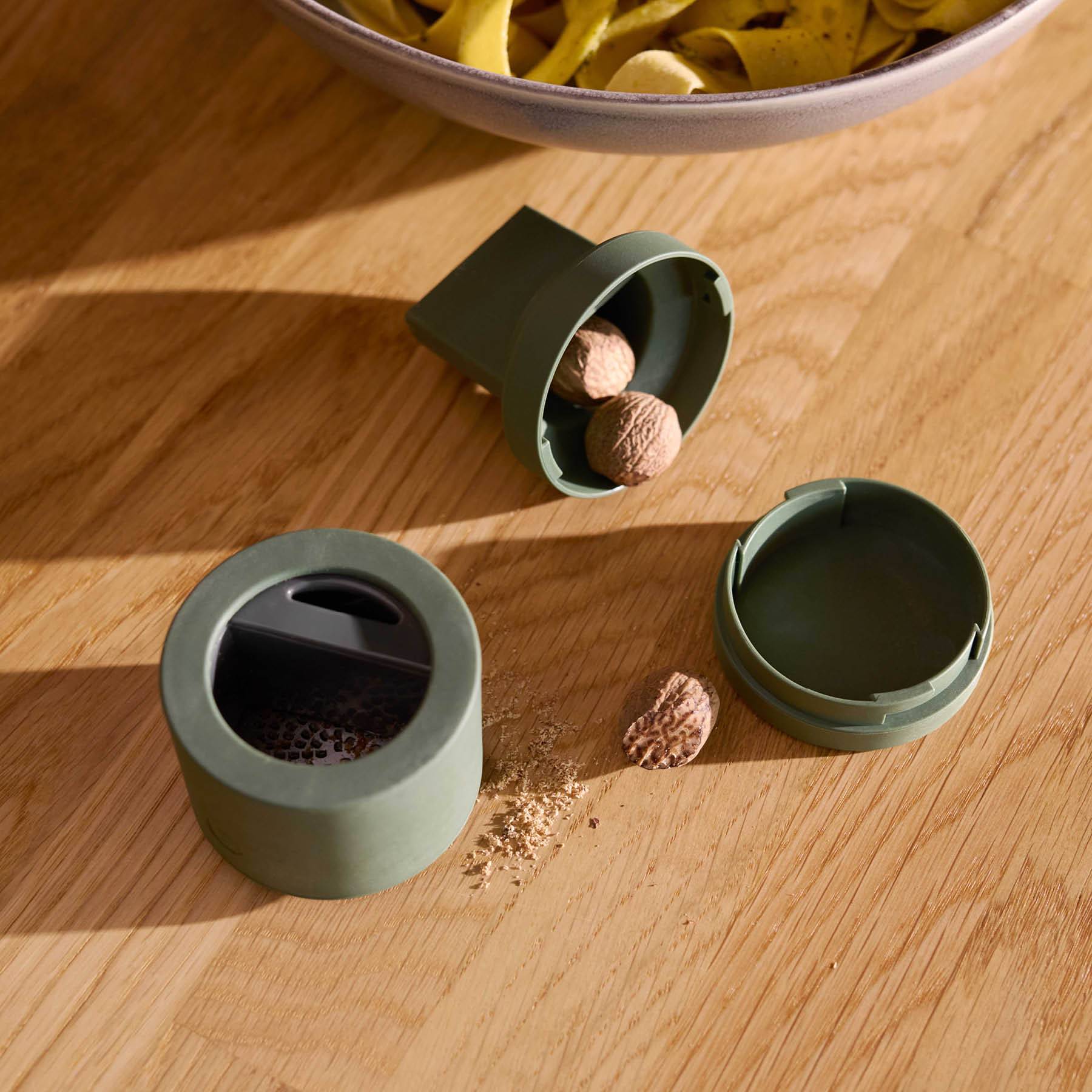 - Im Uhrzeigersinn drehen, um die Muskatnuss frisch zu reiben