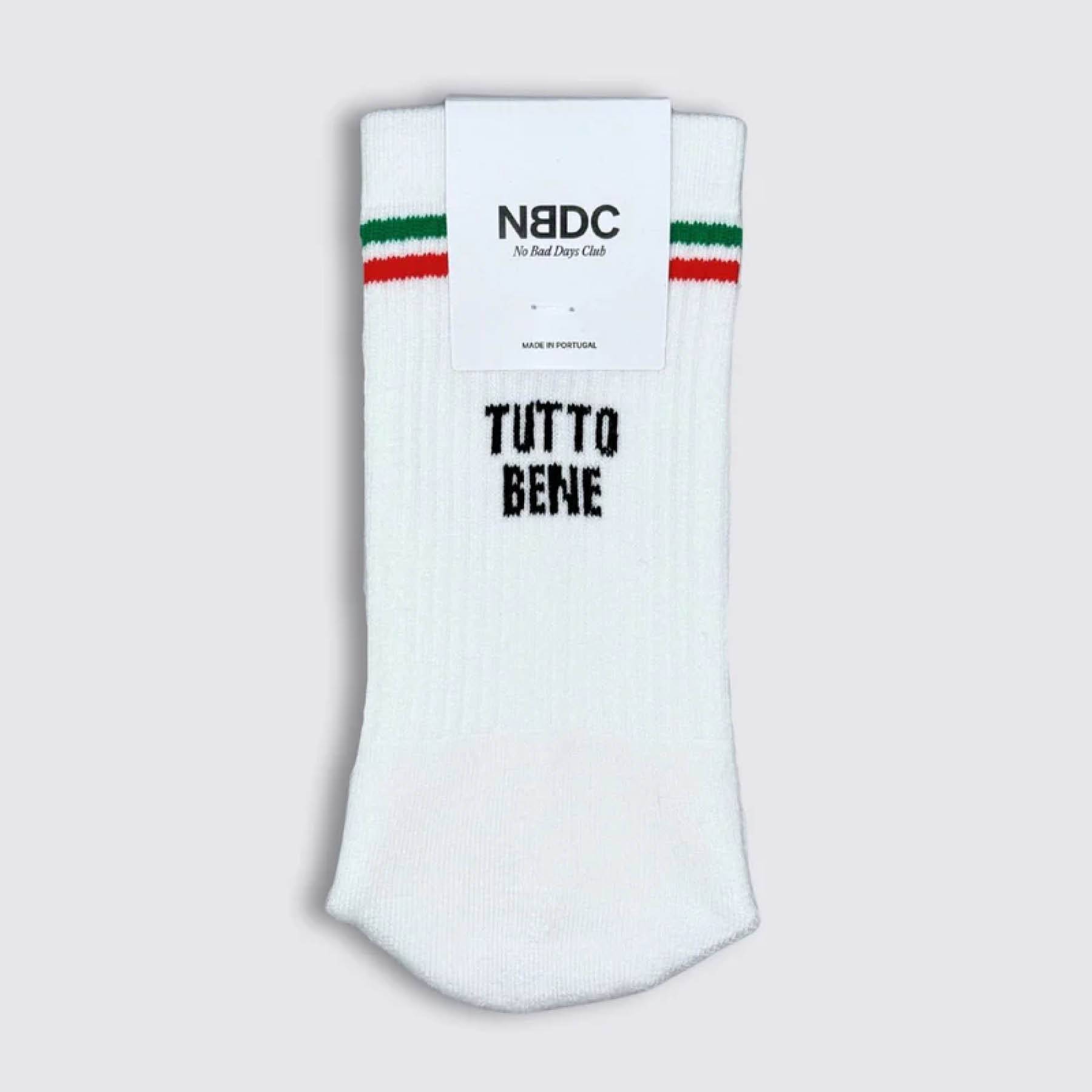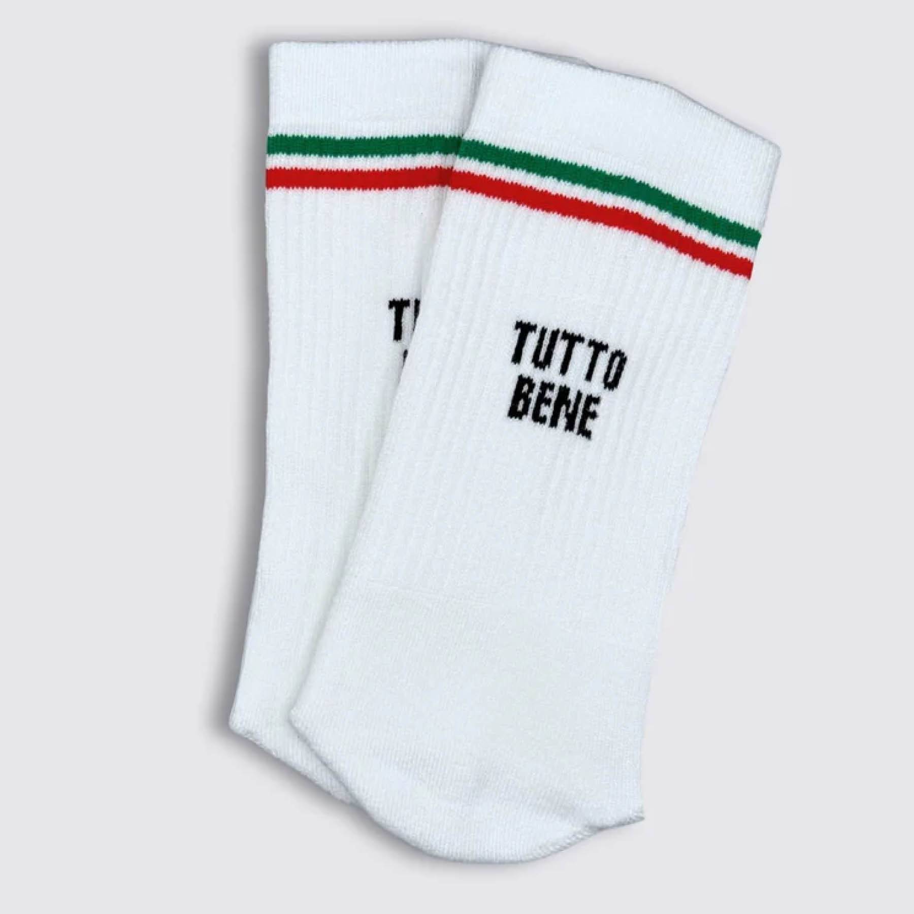 Alles gut – wirklich. TUTTO BENE bringt italienische Lässigkeit an den Fuß, charmant und entspannt. Schwarze Message auf weißem Socken, mit Retro-Streifen in Italien-Farben – easy, aber mit Haltung.