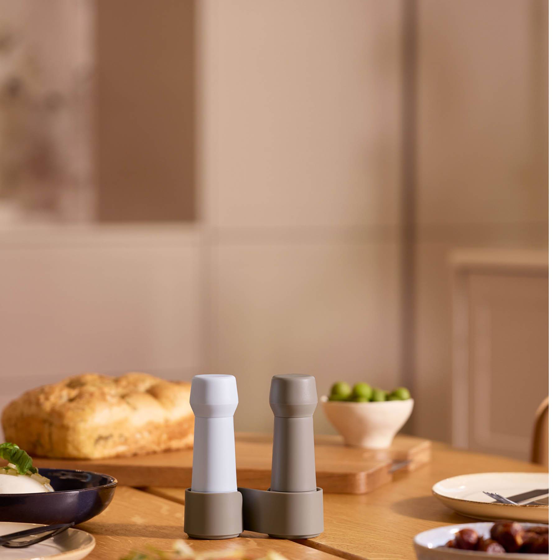 Erhältlich in modernen Farb-Kombinationen bringt dieses Design Gewürzmühlen Set nicht nur Geschmack, sondern auch Persönlichkeit auf jeden Tisch.